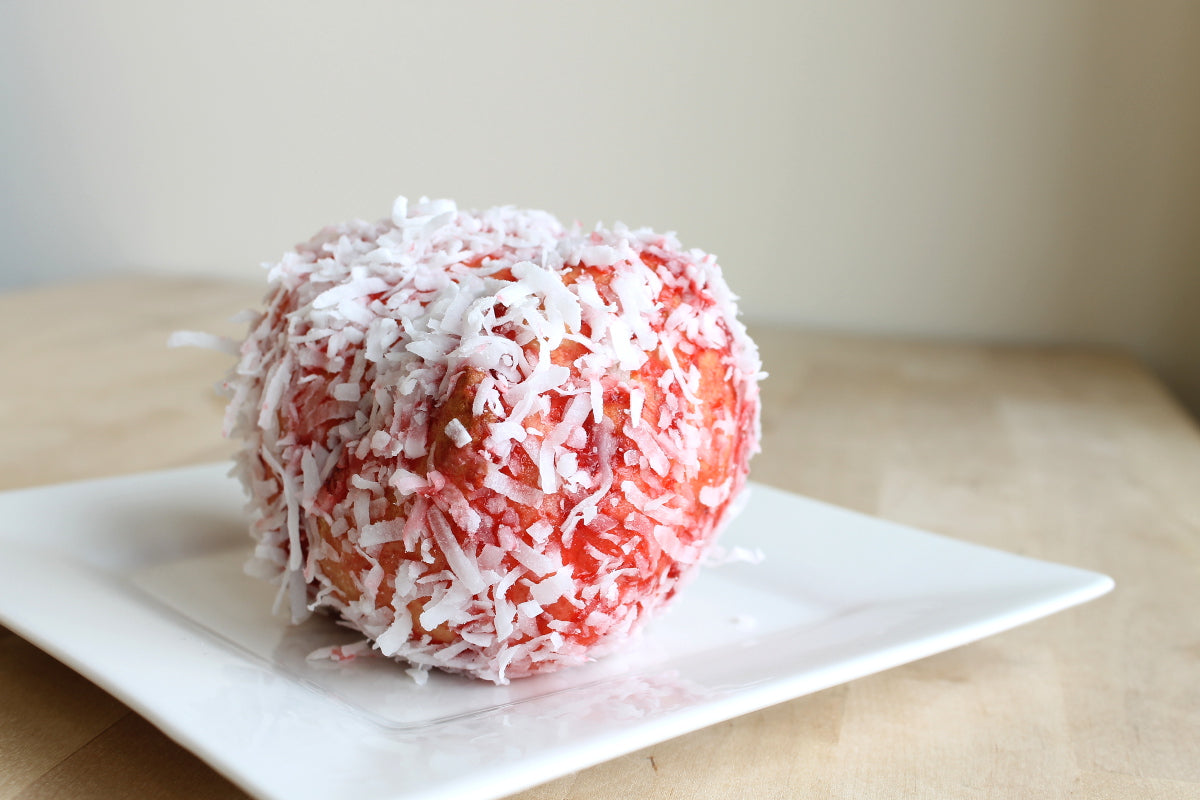 cake like pastries look alike sandwich with strawberry jam and covered with coconut.